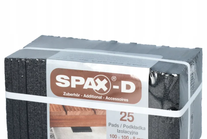 - Guma: Podkładki tarasowe Spax są wykonane z elastycznego i odpornego na warunki atmosferyczne materiału, takiego jak guma. Guma jest wybierana ze względu na swoją elastyczność, która pozwala na absorbowanie wibracji i zmniejszanie nacisku na podłoże.